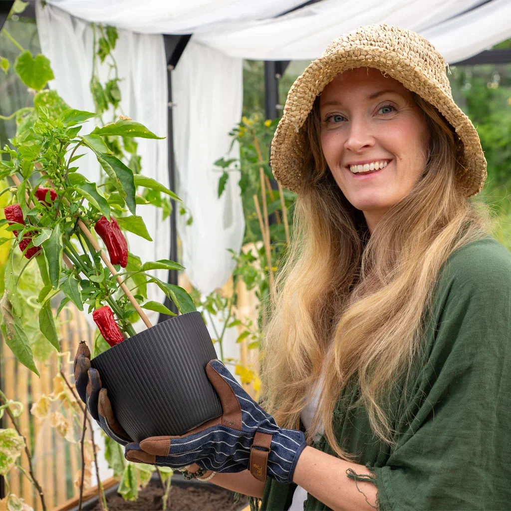 Tanja er storfornøyd med å ha fått seg drivhus. Det utvider hagesesongen og snackpaprikaen er en av de mange vekstene som stortrives her inn.