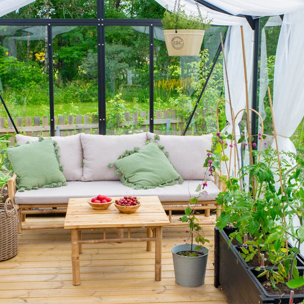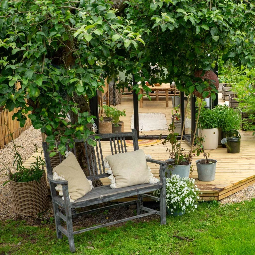 Et drivhus i hagen gir mulighet for å skape mange ulike soner og miljø på utsiden rundt veggene. Ved inngangen har Tanja laget to ulike sittesoner som inviterer til hagekos og nytelse.