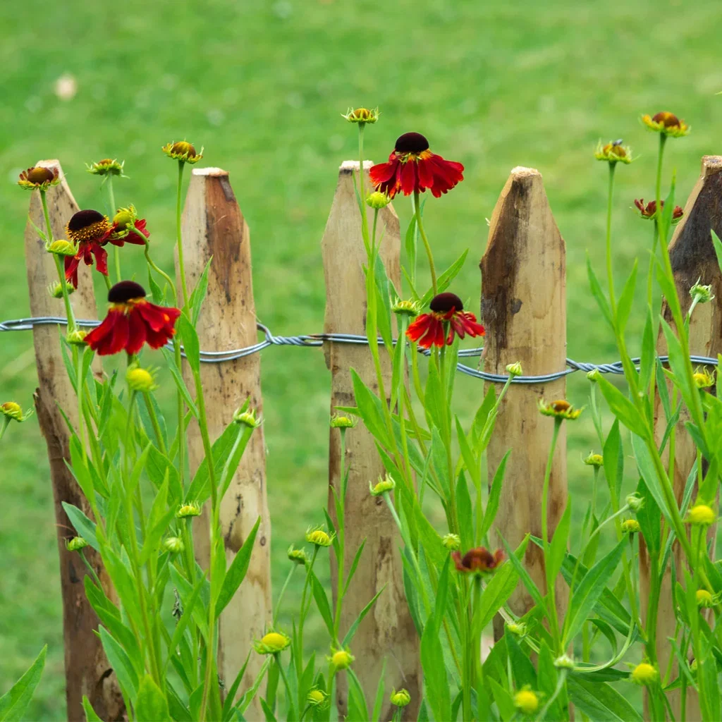 Den høye stauden praktsolbrud 'Moerheim Beauty' er populær blant humlene og nydelig mot kastanjegjerdet som rammer inn hagen.