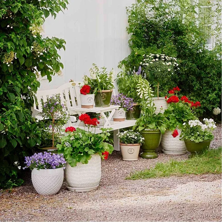 Stilen og fargen på pottene er selvsagt også viktig. Å velge én stil eller farge på alle potter gir et helt annet uttrykk enn om du mikser og matcher potter i ulike farger og materialer. Begge stiluttrykk fungerer, så her gjelder det bare å finne ut hvilket uttrykk du vil oppnå. Liker du middelhavsstilen, vil bleke, støvete terracottapotter fremheve den. Om du heller vil gå for en stilren, nordisk hage, kan enkle potter med rene linjer i sort, grå, beige og myke hvitfarger gjøre susen. For den romantiske stilen er det gjerne lyse farger som gjelder, og mer detaljer i form av struktur og mønstre.